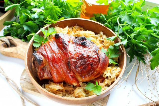 На противень для запекания выложите ровным слоем капусту, а сверху уложите рульку. Отправьте в заранее разогретую духовку при 200 градусах на 20-40 минут. Время запекания и температура зависят от возможностей вашей духовки. Если вы готовите рульку впервые, то не отходите далеко от духовки и периодически заглядывайте не подгорает ли мясо.