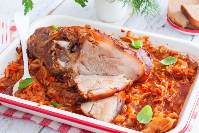 Готовую рульку с капустой аккуратно достаньте из духовки. Дайте ей немного остыть, чтобы было комфортно нарезать её на части. Это самостоятельное блюдо. Подавайте мясо с капустой, можете предложить в компанию отварной картофель.