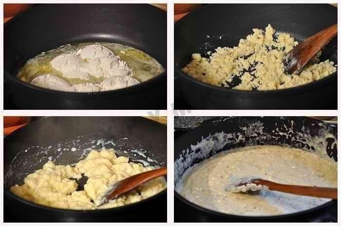 Натереть сыр на крупной терке. На оливковом масле обжарить лук, нарезанный кубиками, до золотистого цвета, и выложить его в тарелку. В разогретой сковороде распустить сливочное масло, добавить муку, и на среднем огне, непрерывно помешивая, обжаривать минуты три. Затем небольшими порциями вливать молоко помешивая лопаткой, чтобы не образовывались комки.Имейте ввиду, что соус получается очень густой. В конце влить сливки и дать варить несколько минут.