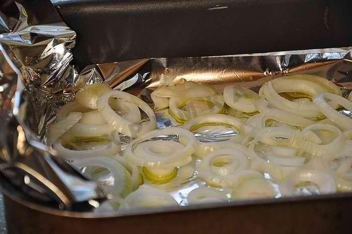 На противень выложить фольгу, смазать ее оливковым маслом и уложить лук, порезанный кольцами. Мясо слегка посолить, но, если соус достаточно соленый, то можно и не досаливать.