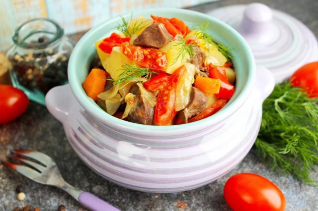 Как запечь свиное сердце в горшочках в духовке с картошкой? Подготовьте все необходимые продукты. Овощи можно использовать любые на ваш вкус. Я взяла стандартный набор, который имеется практически в каждом доме. Помидоры подойдут любые, как черри, так и обычные. А при желании их можно вовсе исключить.