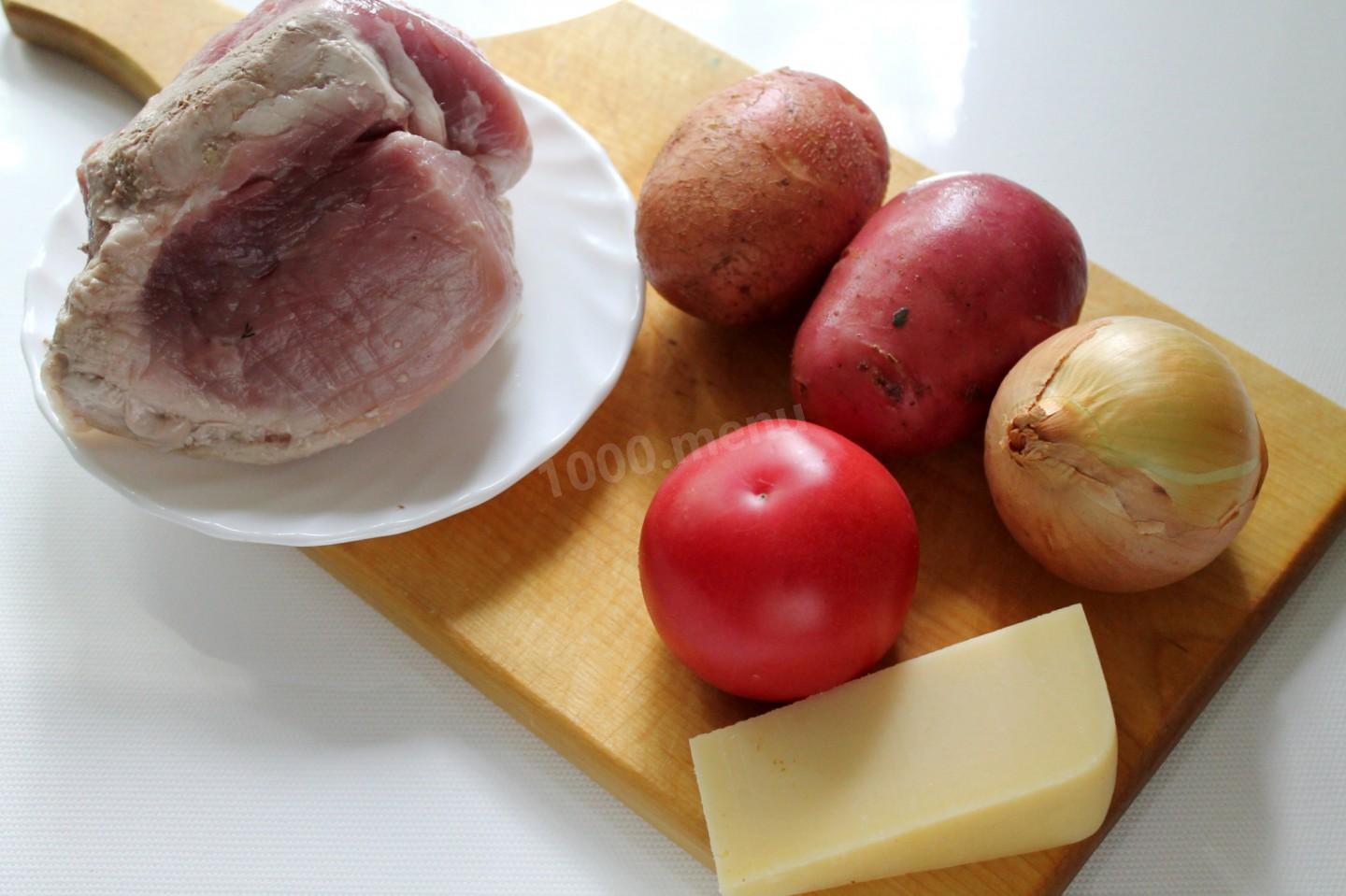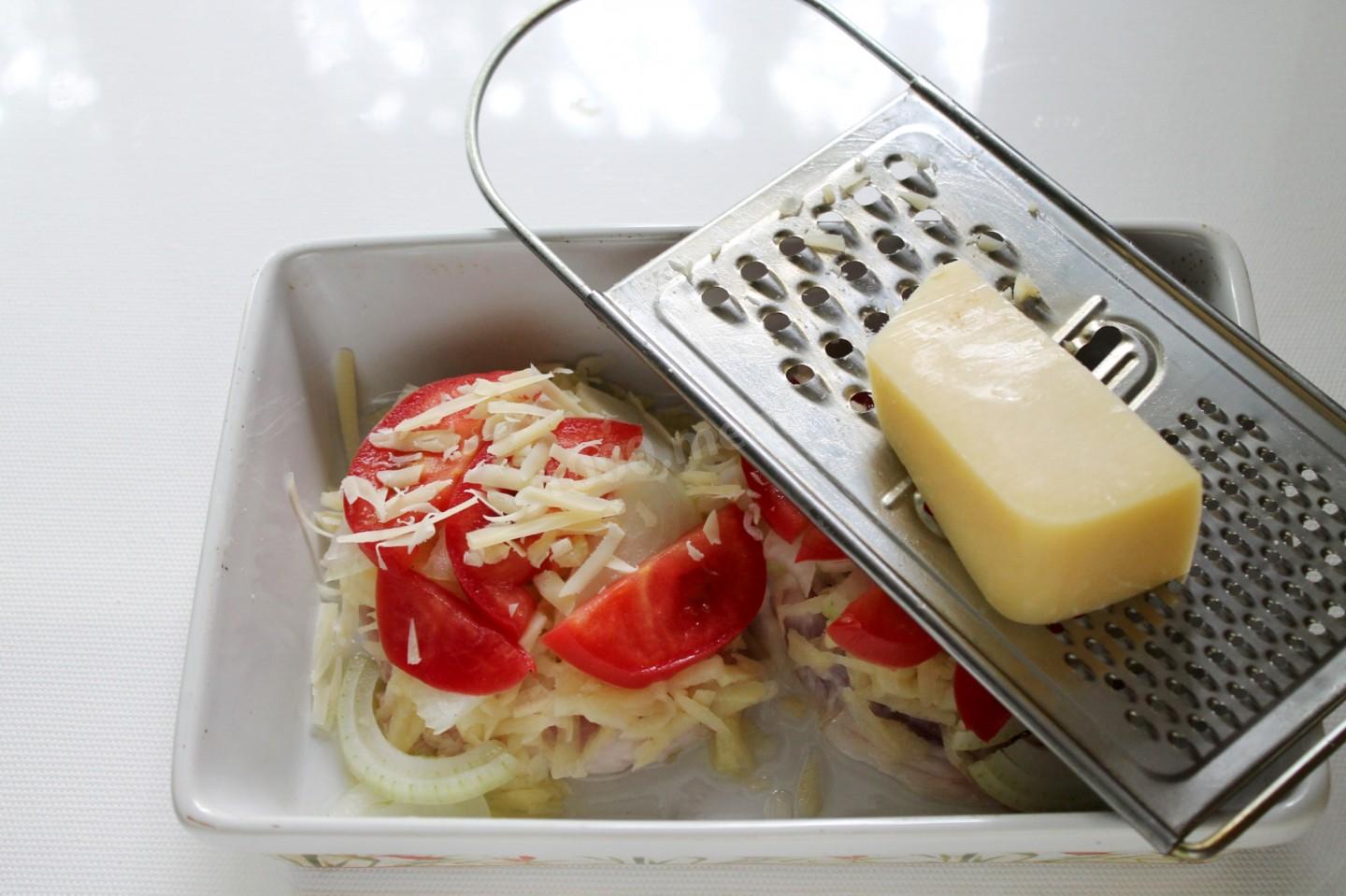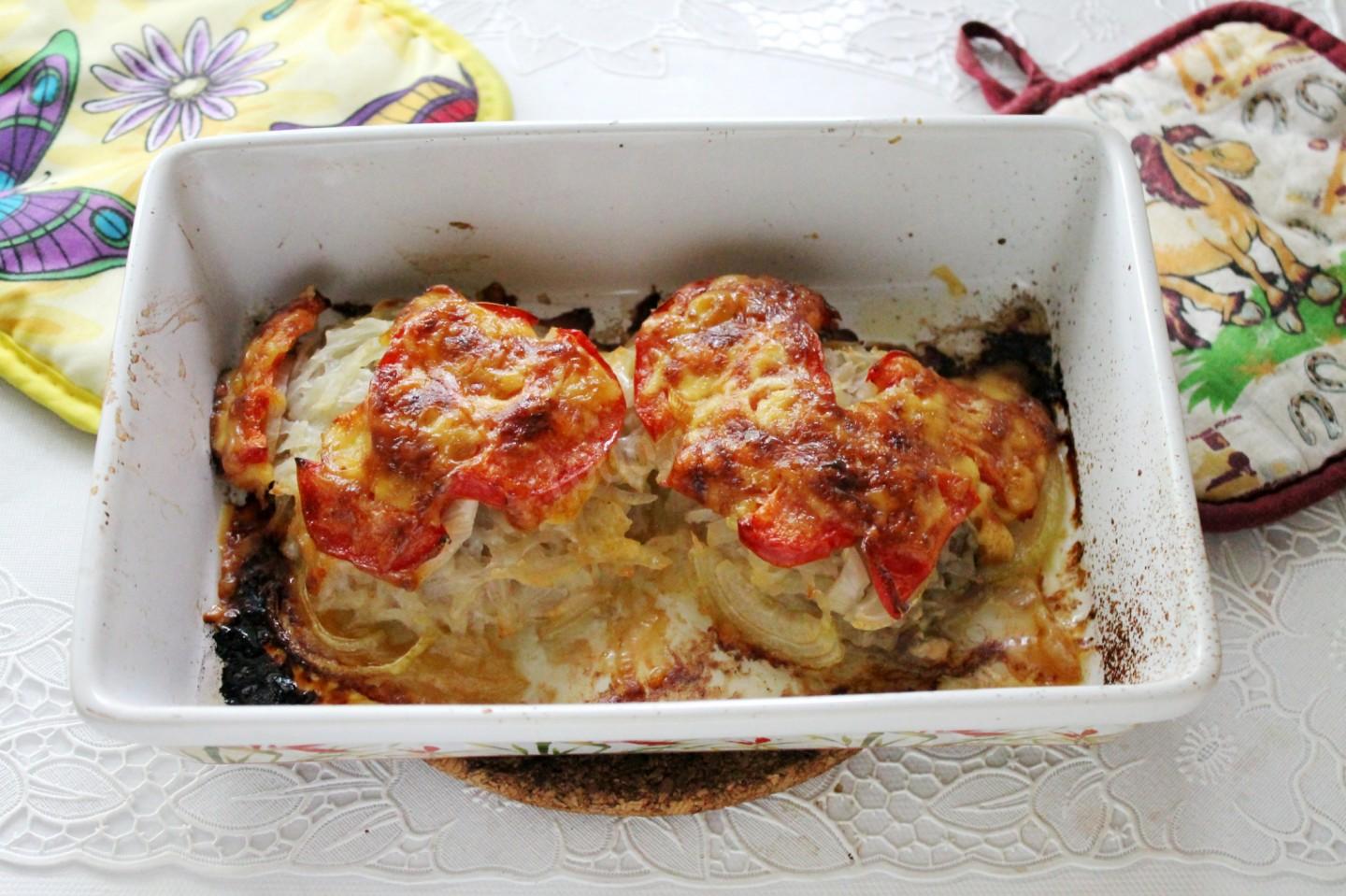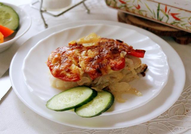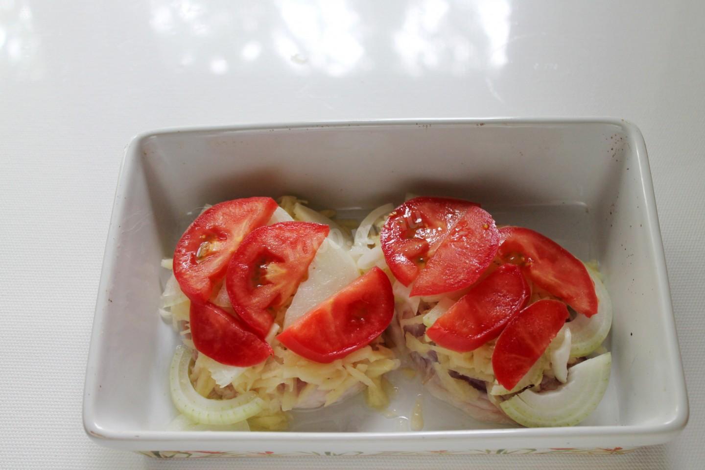 На картофель положите полукольца лука и дольки помидора. Посолите, поперчите.