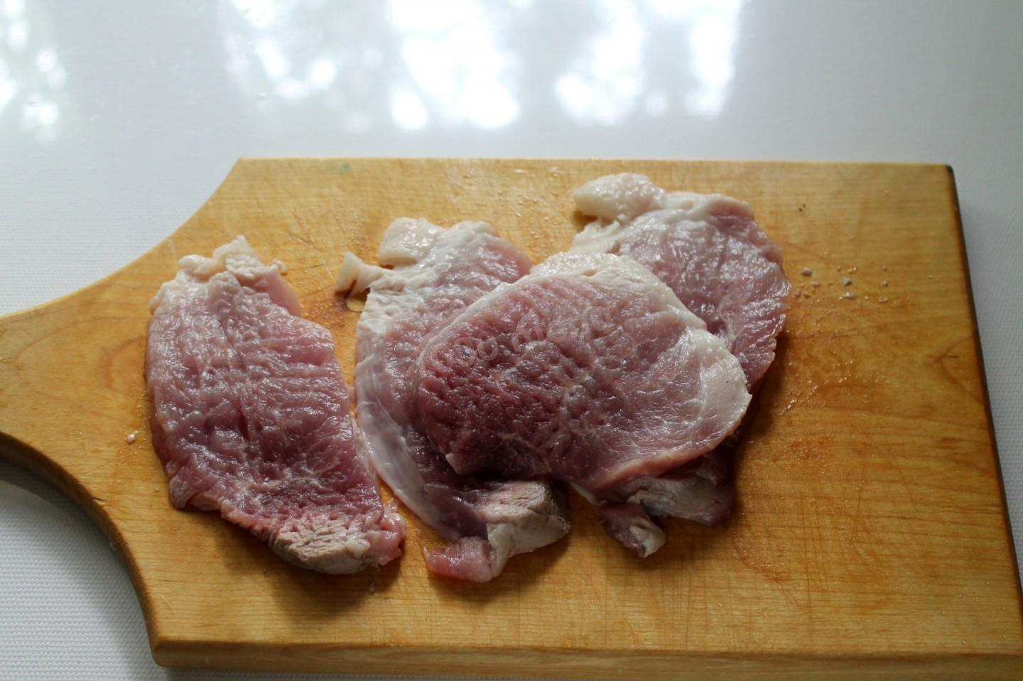 Свиной карбонат порежьте поперек волокон на порционные куски толщиной около 1 см. Накройте мясо пищевой пленкой и отбейте кухонным молотком или тыльной стороной большого ножа. У меня это будут два куска мяса.