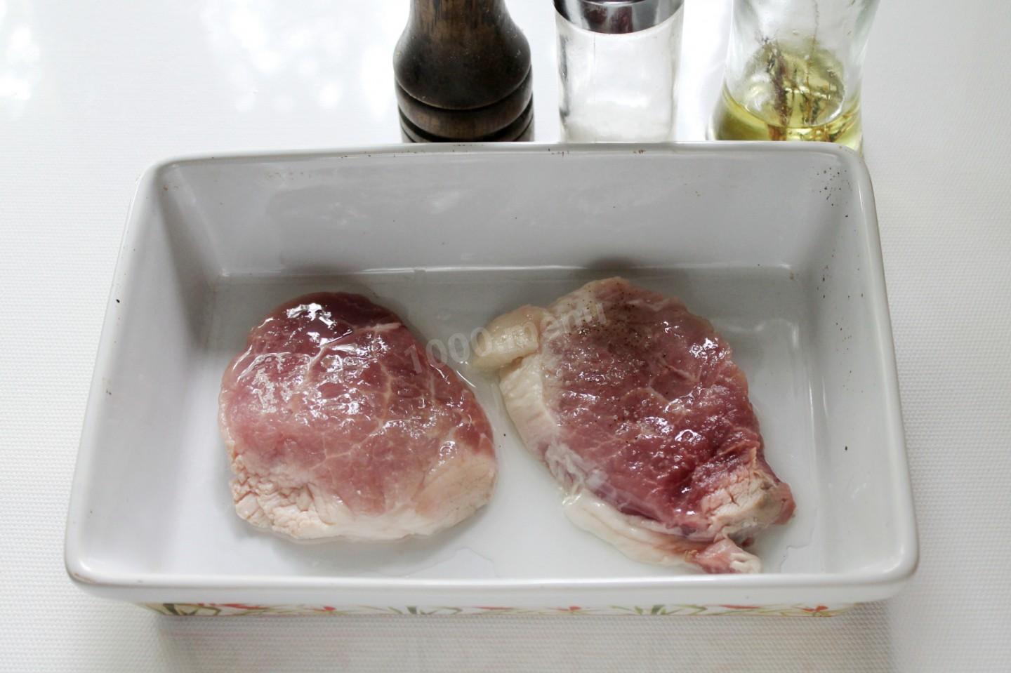 Форму для запекания мяса смажьте маслом и выложите в нее куски свинины, обваляв их в этом масле. Посолите свинину и поперчите. Посыпьте итальянскими травами. Желательно использовать глубокую форму, чтобы отбивные вместе с начинкой не доходили до ее краев. Иначе часть начинки прилипнет к фольге, которой мы будем накрывать мясо.