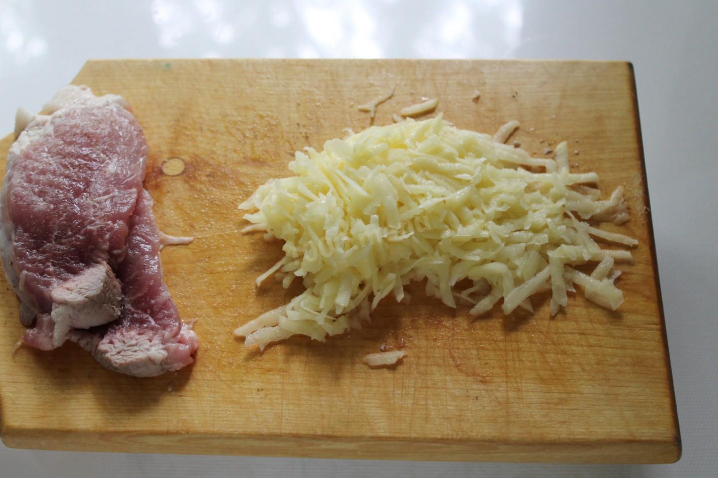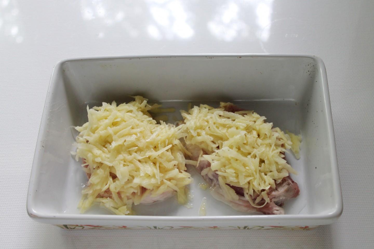 На куски мяса выложите тертый картофель (на 2 отбивные достаточно 1 картофелины среднего размера).