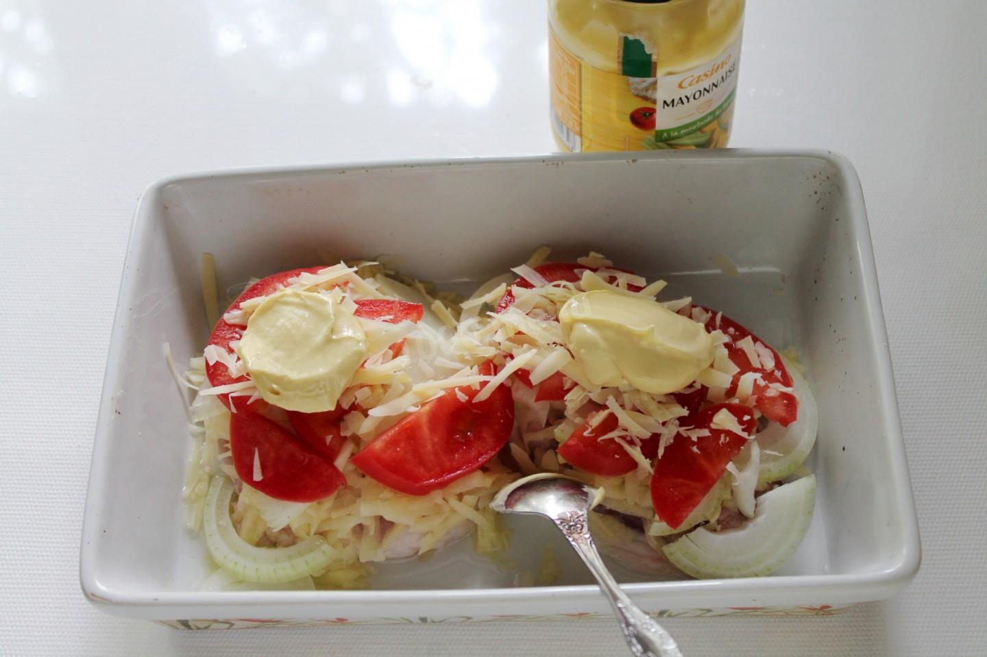 Нанесите поверх тертого сыра майонезную сетку. Или просто положите майонез горкой. Я кладу по 1 чайной ложке на каждую отбивную. Майонез можно слегка размазать по поверхности.