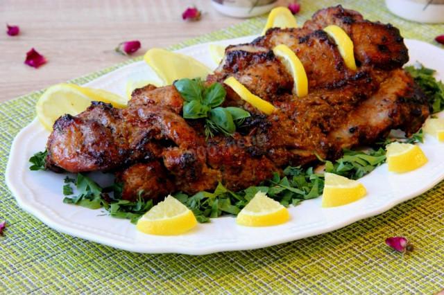 Готовим Маринад. Лук мелко натереть. Добавить по 1/2 ч.л. сух. приправы для свинины, мяса или шашлыка, сух. аджику, соль. По щепотке сух. чеснок и кинза. Острой или не очень, но аджику на томатах - 1,5ст.л. Последним влить 2 ст.л. растительное масло, хорошо перемешать.