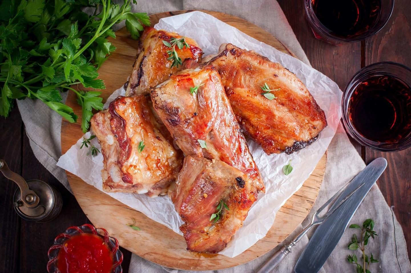 Рёбрышки разрезать на части. Разрезать по одному ребру не стоит, так как из-за этого будет очень сохнуть мясо. Выложить в форму для запекания или большую чашу.