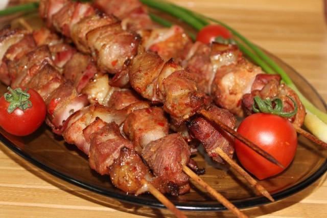 Куски мяса, чередуя с кусочками грудинки нанизать на шпажки. Деревянные шпажки предварительно вымочить в воде. Лук уже нам не нужен, его выбрасываем, он свою главную роль уже исполнил.