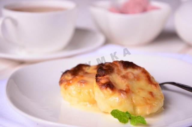Сырники выкладываем в форму и заливаем соусом, он должен на половину покрывать сырники. Форму ставим в духовку и доводим соус до кипения. Выключаем и подаем.