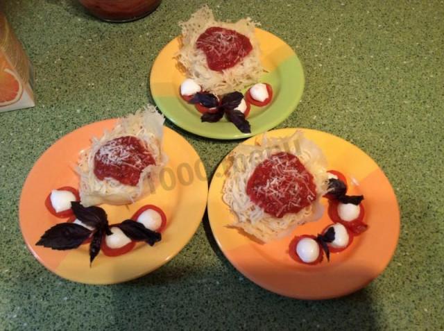 В каждую корзиночку аккуратно выложить отваренные до готовности спагетти, сверху выложить томатный соус. Помидорки черри и моцареллу порезать пополам. На каждую половинку помидорчика положить половинку моцареллы и украсить листиками базилика, сбрызнуть оливковым маслом. Всё. Италия у вас дома!