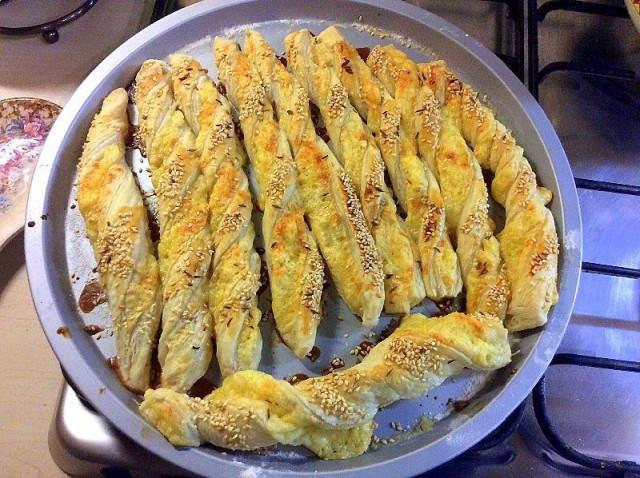 Укладываем на предварительно смазанную маслом форму ( или пергамент, масло с присыпанной мукой- чтоб не прилипла выпечка). Аккуратно снимаем с доски полоски и скручиваем в разных направлениях за концы, получаются такие вьюночки, можно сделать и ровные палочки.
