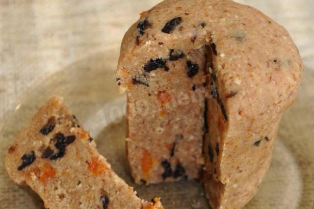 Миндаль и орехи замочить на 10 мин. у тёплой воде. Почистить, смолоть в кофемолке или блендере. Добавить мёд, замесить крутое тесто. Вмешать сухофрукты и сформировать паску. Выпекать не надо.