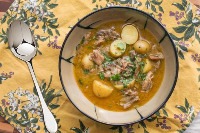 12. Затем выкладываем в казанок мясо черепахи, картофель, лавровый лист. Доливаем бульон, в котором варилось мясо, так, чтобы все ингредиенты были покрыты.