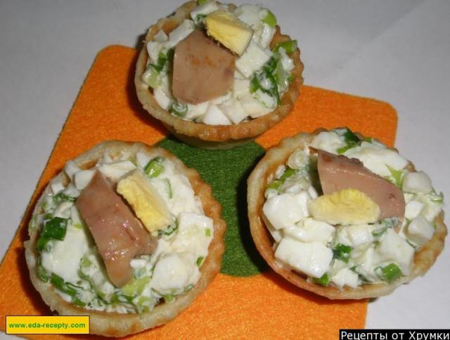 Тарталетки с печенью трески и яйцом, зеленым луком и укропом