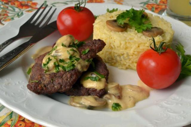 6. Готовое мясо выложить на тарелку, полить сливочно-грибным соусом, оформить помидорами и зеленью.