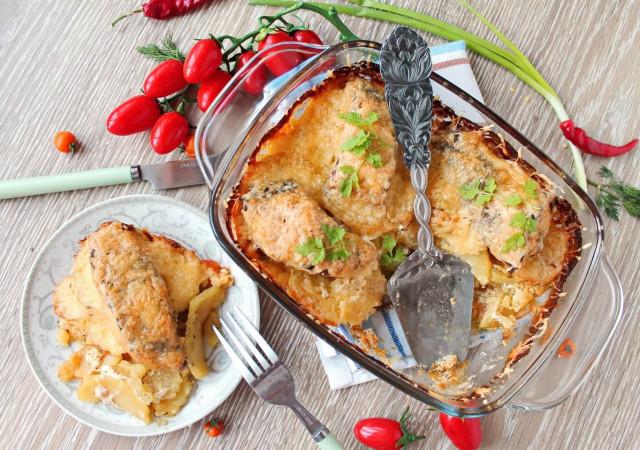 Окуните каждый кусочек терпуга в сметанную смесь и уложите сверху картофеля. Вылейте остатки сметаной массы в форму и немного потрясите ее, чтобы жидкость равномерно разлилась.