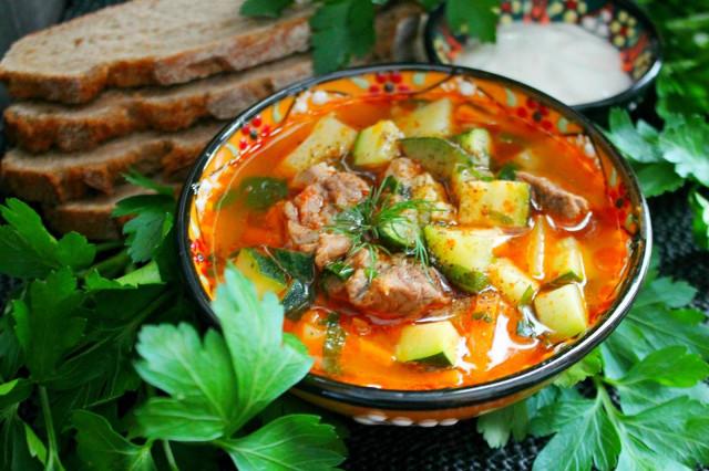 Густой, наваристый, сытный и очень вкусный! Томатный суп с мясом и цукини согреет и насытит холодными зимними вечерами. Густоту супа можно регулировать на свой вкус, добавив чуть меньше и больше воды.
