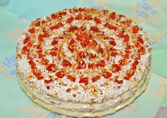 Верх торта я украсила кокосовой стружкой, затем по спирали выкладывала нарезанную курагу и посыпала измельченными орехами. Оставьте торт в холодильнике на несколько часов для пропитки.