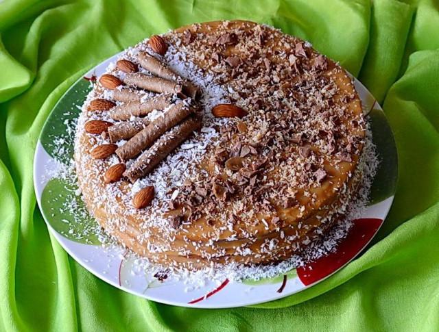 Можно присыпать его крошками от коржей, измельчёнными вафлями или шоколадом. Любыми орехами или семечками, кокосовой стружкой. Торт нужно на часик оставить в тёплом месте, чтобы коржи пропитались кремом. Тортик станет ещё вкуснее, если его затем охладить. Если у Вас есть время, оставьте его в холодильнике на 8-10 часов. А теперь зовите семью или гостей на чаепитие с очень вкусным тортиком. Приятного аппетита!