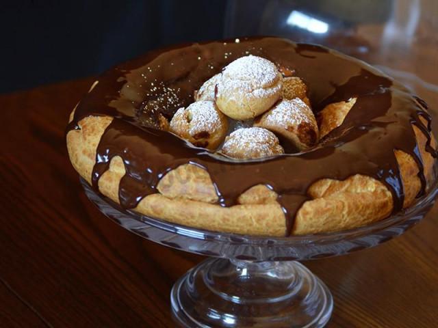 5. Получившейся глазурью, когда она немного остынет, живописно полейте торт так, чтобы замаскировать под шоколадом отверстия, оставшиеся после заполнения кольца кремом.