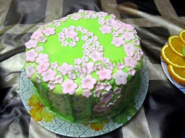 Накрываем тарелкой и ставим пинчер в холодильник на сутки, чтобы пропитался. Затем переворачиваем торт на тарелку, освобождаем от формы и пленки, при этом верх будет ровненький. Украшаем по своему вкусу.