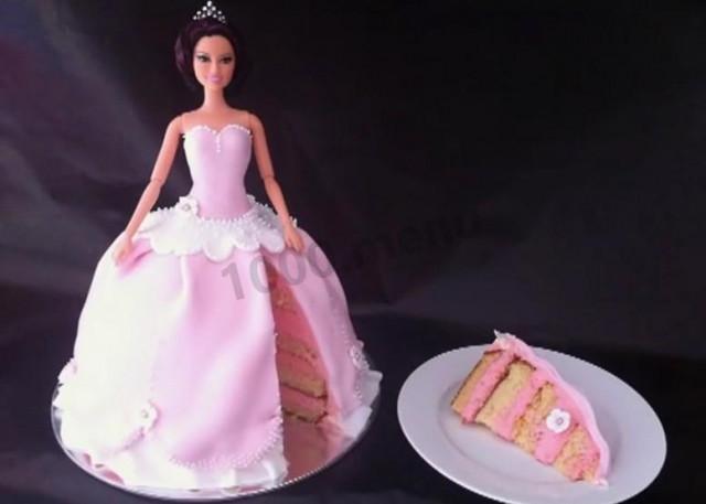 Поместить круг сверху на торт у отверстия впритык к кукле. Лишнее обрезать.