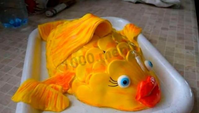Из мастики сделайте и разукрасьте глаза и рот рыбе. Прикрепите их куда нужно. Дайте краске подсохнуть.