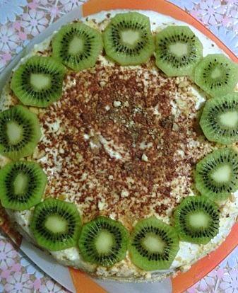 Для крема взбиваем сметану с сахаром, можно добавить творог, вкуснее получается. Коржи смазываем пока тёплые. Между ними можно положить банан кружочками, сверху украсить киви, тертым шоколадом. Сначала торт пусть постоит часик пропитается, потом в холодильник. Приятного чаепития!