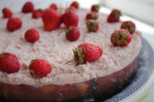 Маскарпоне смешиваем с ванилином, сахарным песком и клубничным пюре. Крем должен быть очень густым, его укладываем ровным слоем сверху фруктов. Торт ставим в холодильник. А перед подачей украшаем ягодами клубники. Приятного аппетита!