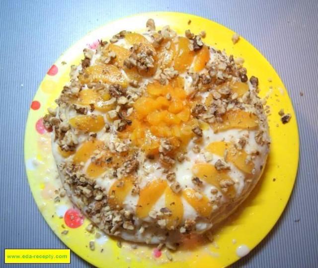 Выкладываем все это в круглую форму и оставляем застывать. Через 3 часа форму с застывшей желатиновой массой опускаем в горячую воду. Затем быстро переворачиваем на круглый корж. Затем в миксере взбиваем остатки сливок с ванилином и смазываем ими торт. Украшаем дольками персиков и орехами. Торт из персиков готов!