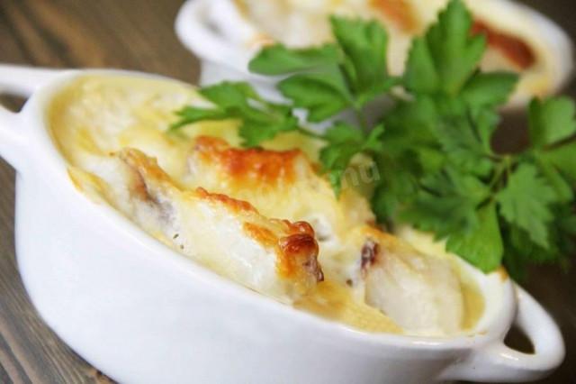 3. Треску нарезаем кубиками среднего размера, выкладываем в порционные формы для запекания, заливаем молочно-яичной семью.