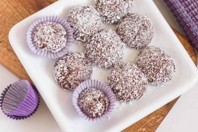 Сформированные конфетки обваляйте в чем-нибудь вкусном: в рубленных орехах, в какао-порошке, в кокосовой стружке, в измельченных вафлях, в сахарной пудре.