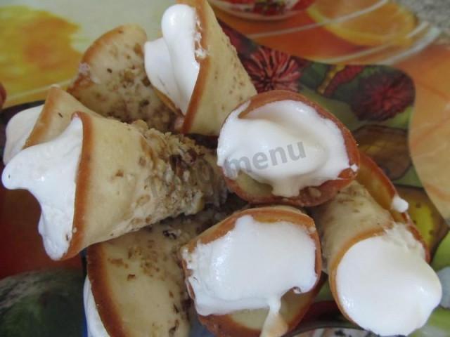 Трубочки с орехом и белковым кремом - для любителей сладенького. Этот рецепт содержит простые и доступные ингредиенты. Трубочки пекутся очень быстро. Совсем немного времени, и лакомство для чаепития готово!