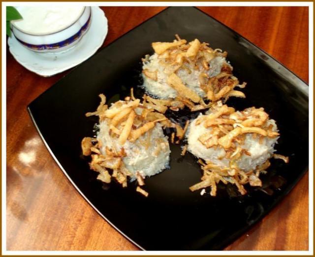 Вынимаем шумовкой готовые цеппелины, выкладываем на прогретое блюдо, поливаем соусом из сметаны, шпика и поджаренного лука.