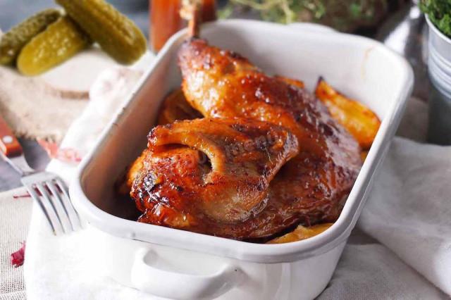 Достаем из духовки, переворачиваем цесарку, смазываем оставшейся глазурью вторую половину и отправляем запекаться еще на 20 минут. Минут за 10 до конца процесса открываем и поливаем соусом, образующимся на дней формы.