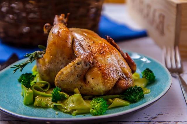 Соус процедите и смажьте им цыплят снаружи, а розмарин и чеснок поместите внутрь курочек. Выпекайте цыплят-корнишонов в предварительно разогретой до 200 градусов духовке на протяжении 30 минут. Форму предварительно смажьте растительным маслом, ножки цыплят свяжите веревочкой вместе.