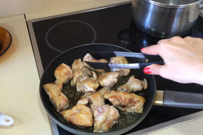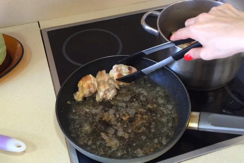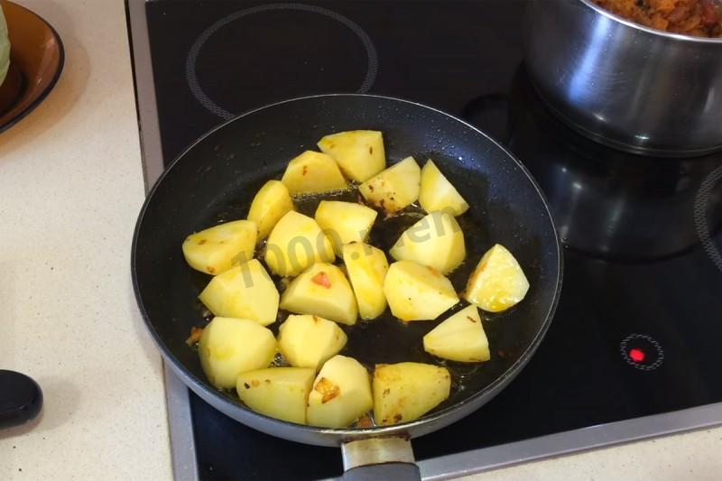 Картофель чистим, нарезаем на 4-6 кусочков и обжариваем до корочки. Поджаристый картофель перекладываем в кастрюлю.
