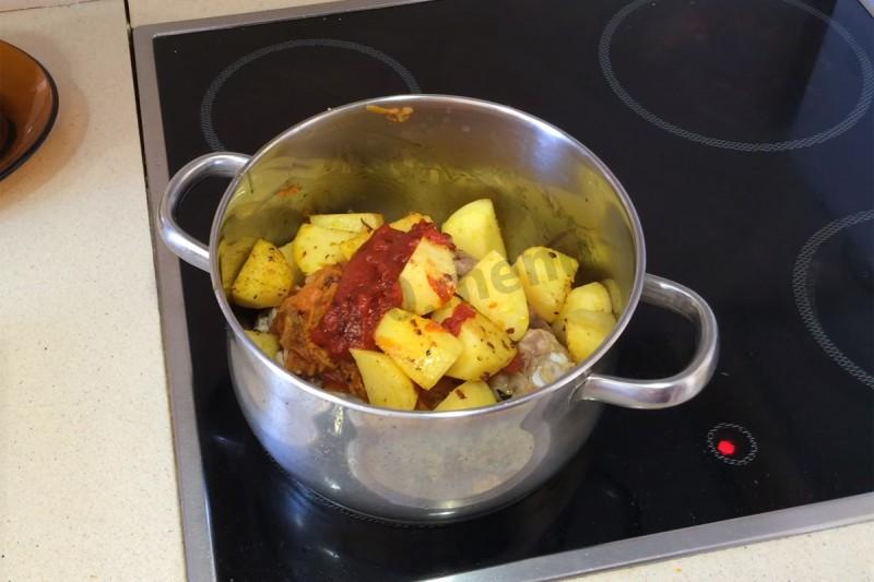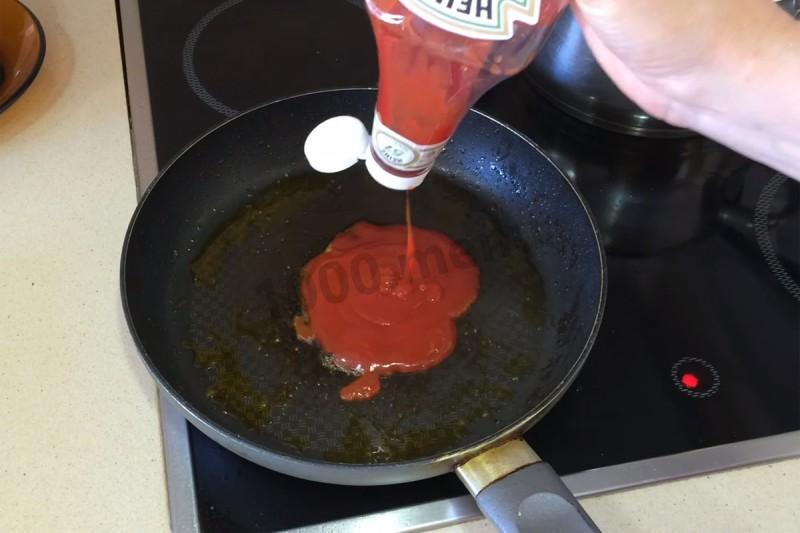 На сковороде обжариваем кетчуп и тоже перекладываем его в кастрюлю.