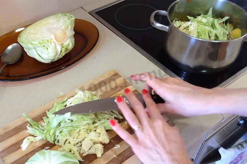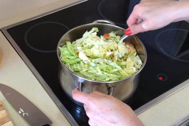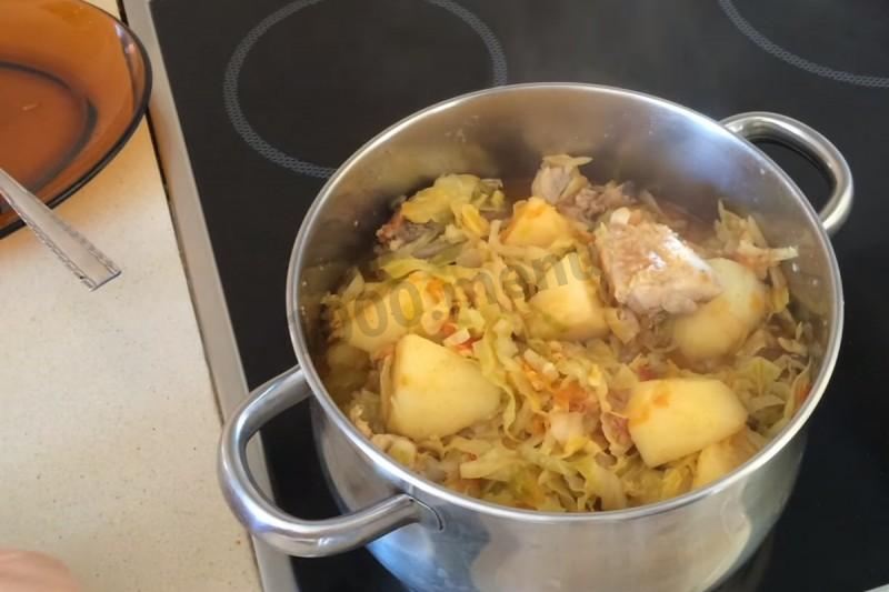 По необходимости солим и перчим. Тушим под крышкой, периодически помешивая, до мягкости картофеля и капусты.