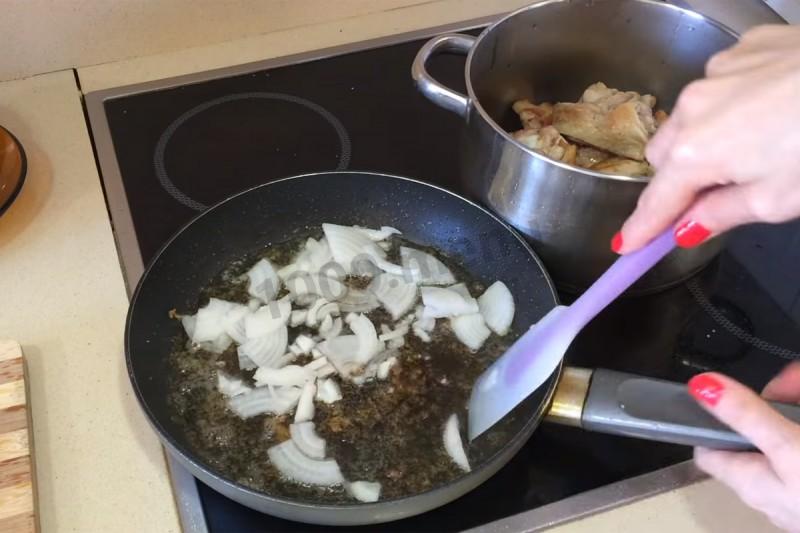 Лук нарезаем тонкими полукольцами и обжариваем на сковороде после мяса.