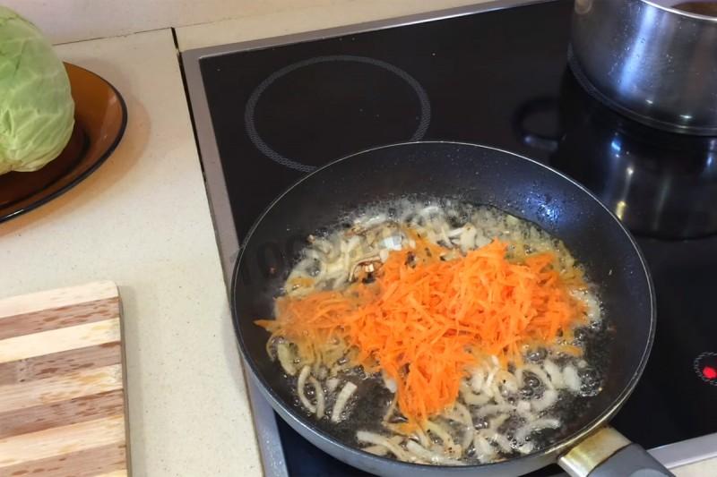 Морковь чистим и трем на крупной терке. Когда лук чуть поджарился, добавляем к нему морковь и убавляем огонь до минимума - морковь должна тушиться, а не жариться.