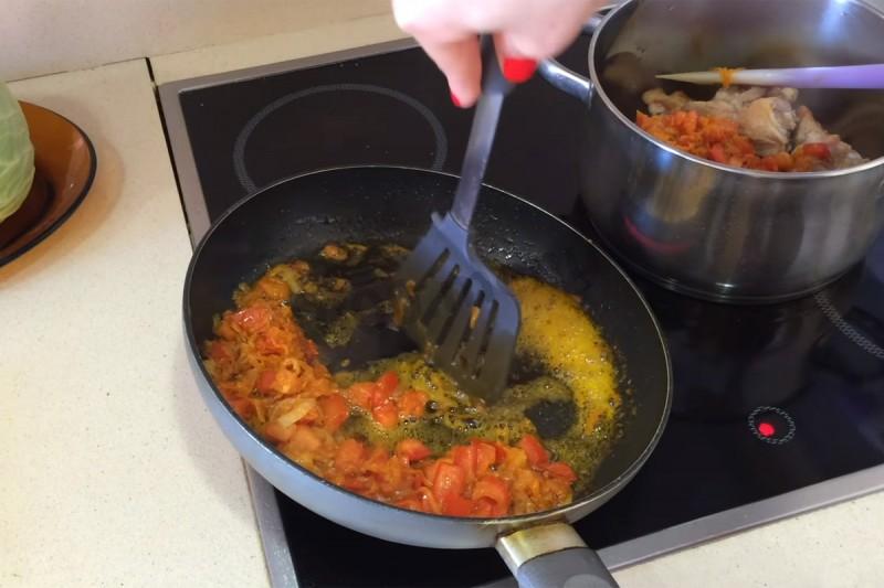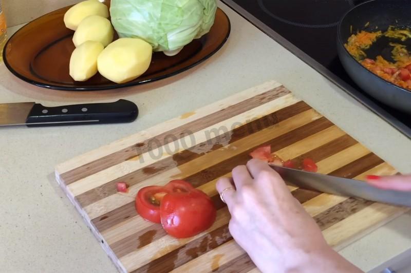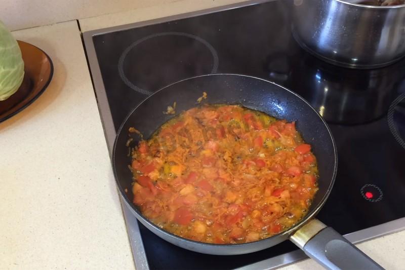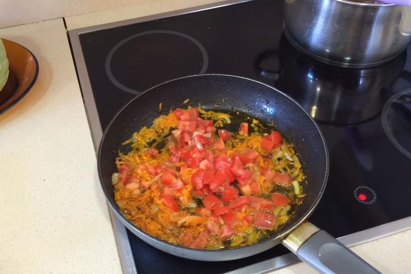 Помидор нарезаем кубиками и кладем в сковороду с луком и морковкой. Тушим. В процессе солим и перчим.