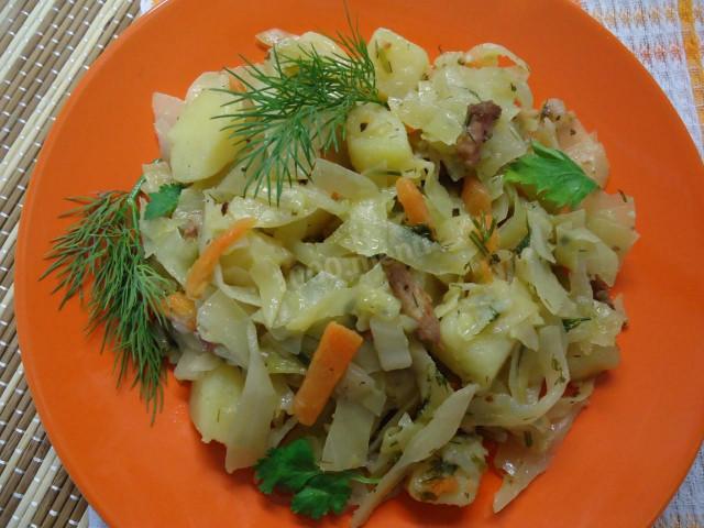 Всесезонное блюдо! Идеально для ужина или обеда! Может выступать как самостоятельное блюдо или как гарнир к любому мясу, рыбе.Получается очень сытно и в то же время калорийность невысока.Кроме того,такая еда не создаёт чувства тяжести в желудке.У каждой хозяйки найдётся не один рецепт тушёной капусты и все готовят её по-своему.Я предлагаю один из моих вариантов.Предварительная обжарка продуктов делает блюдо особенно вкусным и ароматным!