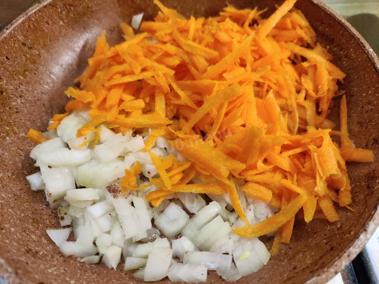 Луковицу очистить от шелухи и нашинковать мелким кубиком. Морковь очистить и натереть на крупной тёрке. Обжарить овощи на подсолнечном масле (одна столовая ложка) до мягкости.