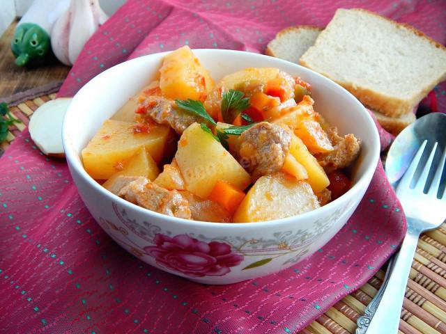 Простое и быстрое блюдо на ужин для всей семьи! Тушеный картофель с индейкой можно назвать блюдом – палочкой-выручалочкой для занятых хозяек. Это простое блюдо позволяет приготовить очень быстро мясо и гарнир вместе. Получается не только очень сытное и вкусное горячее, но и полезное блюдо. За счет способа приготовления – тушение – в составляющих блюда остается максимум полезных веществ. А сочетание белка и углеводов в овощах и мясе делает его очень питательным, обеспечивая организм энергией надолго.