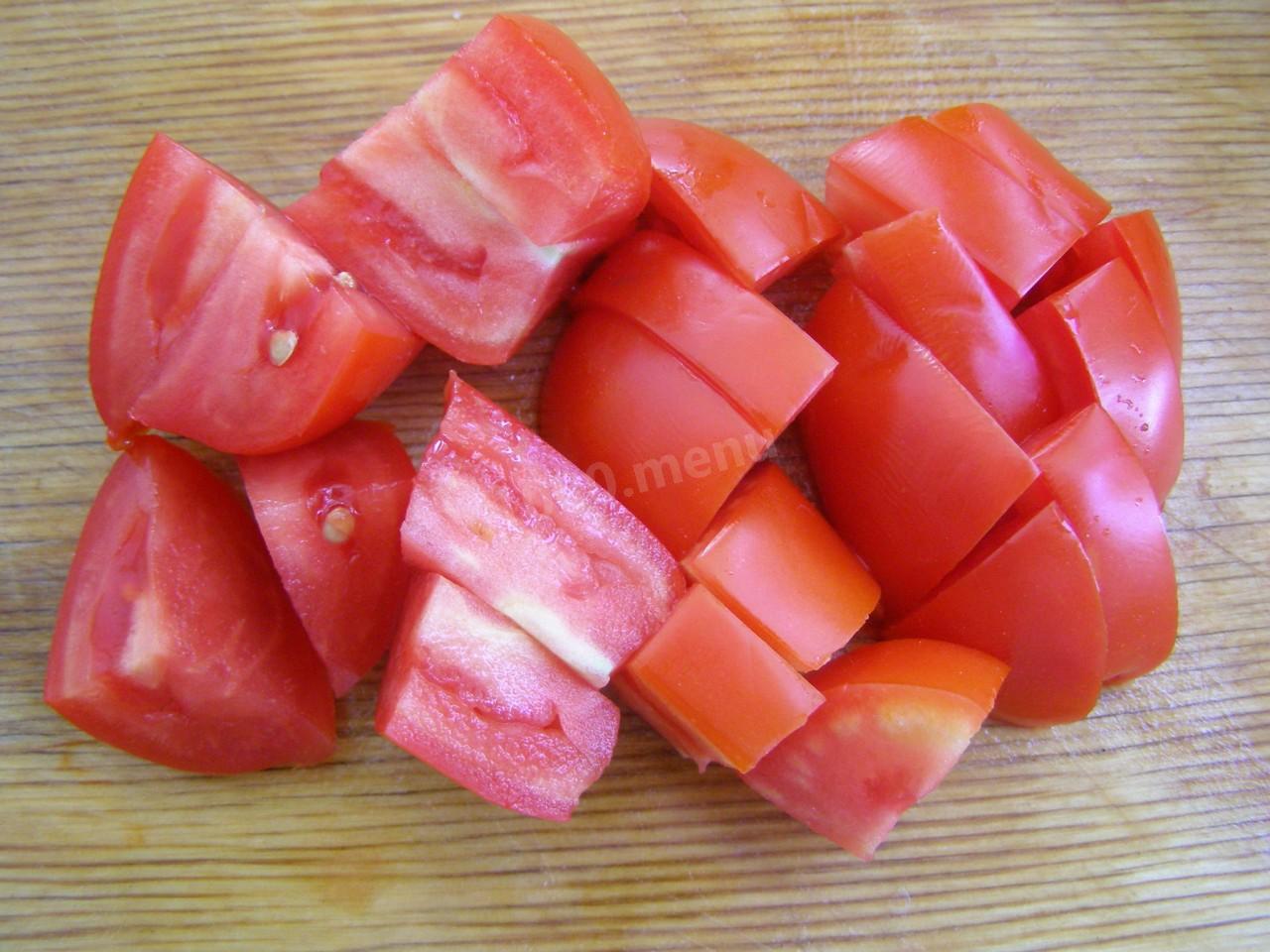 Пока овощи жарятся, поставим воду греться и нарежем кубиком помидор.