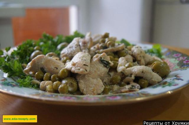 Мелко нарезаем куриное филе (лучше всего верхнюю часть курицы – куриные грудки для этого брать). Затем наливаем в сковороду растительное масло и обжариваем нашу курочку до легкого золотистого цвета. Вливаем сливки и начинаем тушить под крышкой около четырех минут (на слабом огне). Теперь всыпаем нарезанные шампиньоны, перемешиваем, вновь накрываем крышкой и тушим четыре минуты. Настала очередь оливок – тушим с ними под крышкой. Через минутки две добавляем зеленого консервированного горошка. Еще минуты две держим на огне, помешивая, добавляем соли по вкусу, всыпаем черного молотого перчика. Обратите внимание, что наш горошек не должен развариться, поэтому снимаем блюдо с огня, как только горошек хорошенько прогреется. Приятного аппетита!