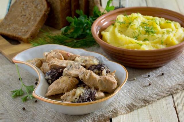 Тушеное филе курочки в сливках и с черносливом. Интригует, правда? ;). Обалденное получается блюдо. Мы его любим готовить к картофельному пюре на сливках. Все такое молочное, а мясо просто тает во рту. Чернослив добавляет пикантных кисло-сладких ноток. Особенно любят дети - без добавки со стульев не встают!