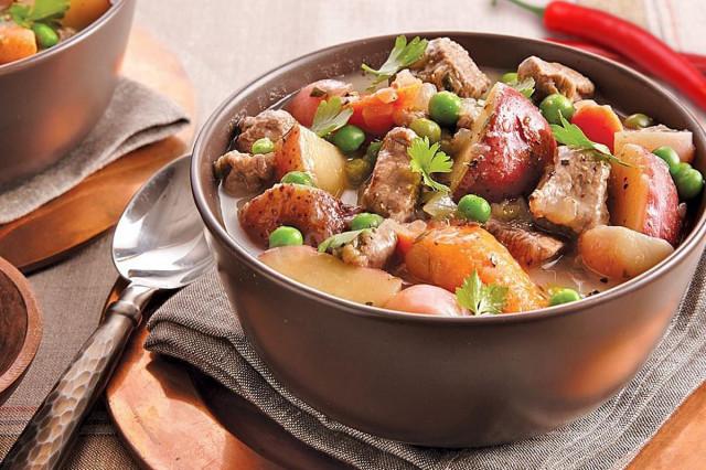 Приготовить казан. Поставить его на плиту и влить немного растительного масла. Нагреть масло до максимальной температуры и обжарить кусочки баранины до коричневого цвета, периодически помешивая мясо. Добавить репчатый лук и также обжарить его вместе с бараниной. Далее всыпать немного муки и сразу хорошо перемешать ее. Через минуту влить красное вино, снова перемешать и готовить на среднем огне еще пару минут. Далее влить куриный бульон, накрыть казан крышкой и варить все вместе примерно 10 минут.
